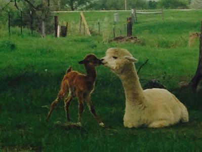 On June 16, 2015 we welcomed our very first cria (baby alpaca), right alongside her mother Gem. The newest addition to our farm was named Ruby, a beautiful red babygirl.